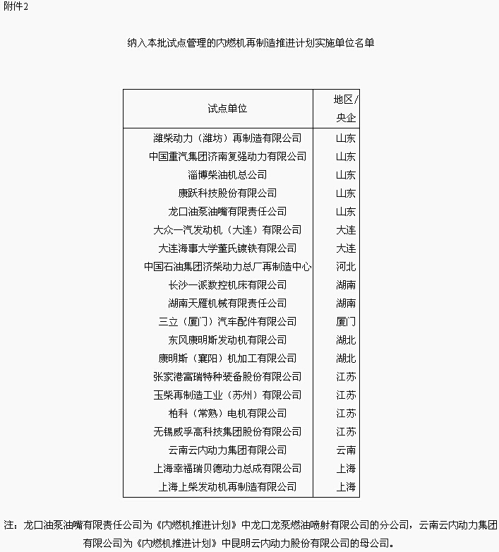 2.纳入本批试点管理的内燃机再制造推进计划实施单位名单
