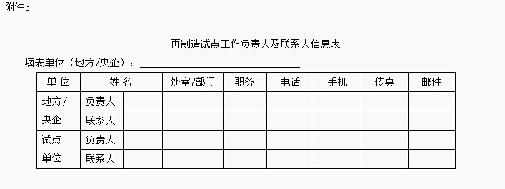 六、为便于试点信息交流与组织协调,请有关地方工业和信息化主管部门、中央企业集团于2016年3月15日前,将本单位及相关试点单位再制造工作负责人及联系人信息汇总后(格式见附件3)报我部(节能与综合利用司),电子版发送至jns@miit.v.cn。