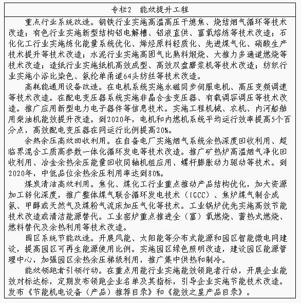 以先进适用技术装备应用为手段,强化技术节能。全面推进传统行业节能技术改造,深入推进重点行业、重点企业能效提升专项行动,加快推广高温高压干熄焦、无球化粉磨、新型结构铝电解槽、智能控制等先进技术。继续推进锅炉、电机、变压器等通用设备能效提升工程,组织实施空压机系统能效提升计划。围绕高耗能行业企业,加快工艺革新,实施系统节能改造,鼓励先进节能技术的集成优化运用,推广电炉钢等短流程工艺和铝液直供,推动工业节能从局部、单体节能向全流程、系统节能转变。提升产品的轻量化水平,推广复合材料、轻合金、真空镀铝纸等高强韧度新型材料,推广超高强度钢热冲压成形技术、真空高压铸造、超高真空薄壁铸造等轻量化成形工艺。普及中低品位余热余压发电、供热及循环利用,积极推进利用钢铁、化工等行业企业的低品位余热向城市居民供热,促进产城融合。实施工业园区节能改造工程,加强园区能源梯级利用,推进集中供热制冷。