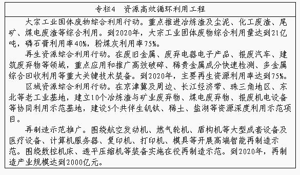 大力推进工业固体废物综合利用。以高值化、规模化、集约化利用为重点,围绕尾矿、废石、煤矸石、粉煤灰、冶炼渣、冶金尘泥、赤泥、工业副产石膏、化工废渣等工业固体废物,推广一批先进适用技术装备,推进深度资源化利用。深入推进承德、朔州、贵阳等资源综合利用基地建设,选择有基础、有潜力、产业集聚和示范效应明显的地区,合理布局,突出特色,加强体制机制和运行管理模式创新,打造完整的工业固体废物综合利用产业链。探索资源综合利用产业区域协同发展新模式,发挥各地优势,推动区域资源综合利用协同发展,实施京津冀地区资源综合利用产业协同发展行动计划,建立若干工业固体废物综合利用跨省界协同发展示范区。