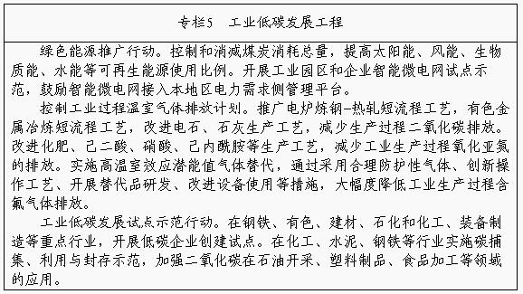 开展工业低碳发展试点示范。继续开展园区试点示范,结合新型工业化产业示范基地建设,加大低碳工业园区建设力度,制定国家低碳工业园区指南,推进园区碳排放清单编制工作,推动园区企业参与碳排放权交易。开展低碳企业试点示范,引导企业实施低碳发展战略,逐步建立低碳企业评价标准、指标体系和激励约束机制,培育低碳标杆企业,增强企业低碳竞争力。鼓励建材、化工等行业实施碳捕集、利用与封存试点示范,促进二氧化碳资源化利用。