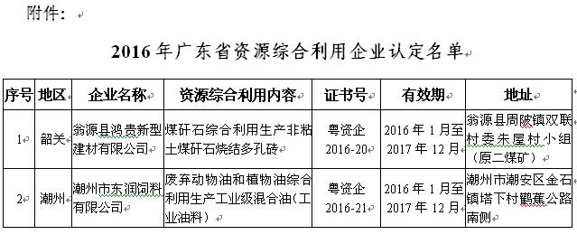 关于公布2016年广东省资源综合利用企业认定名单的通知