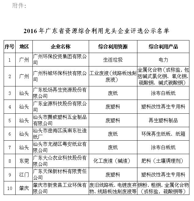附件:2016年广东省资源综合利用龙头企业评选公示名单