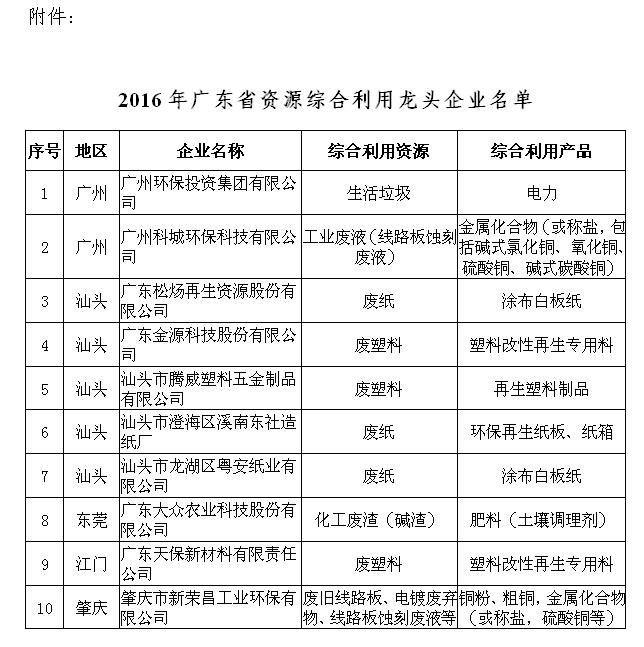 关于公布2016年广东省资源综合利用龙头企业名单的通知