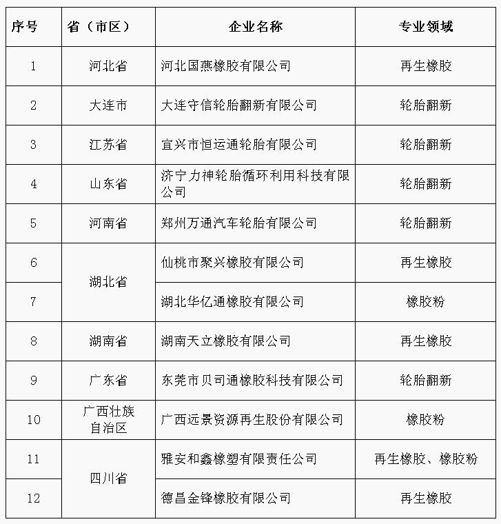 符合《轮胎翻新行业准入条件》、《废旧轮胎综合利用行业准入条件》企业名单(第四批)