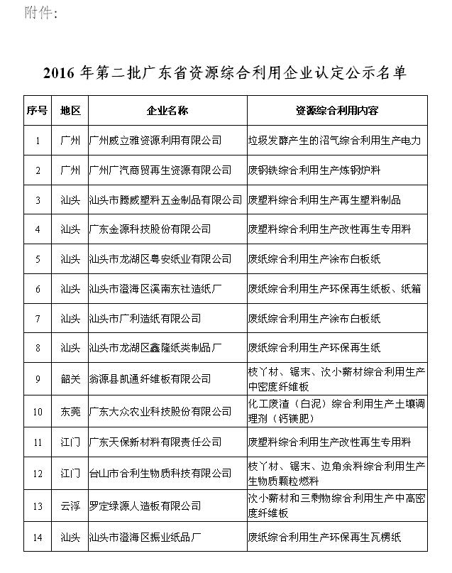 附件:2016年第二批广东省资源综合利用企业认定公示名单
