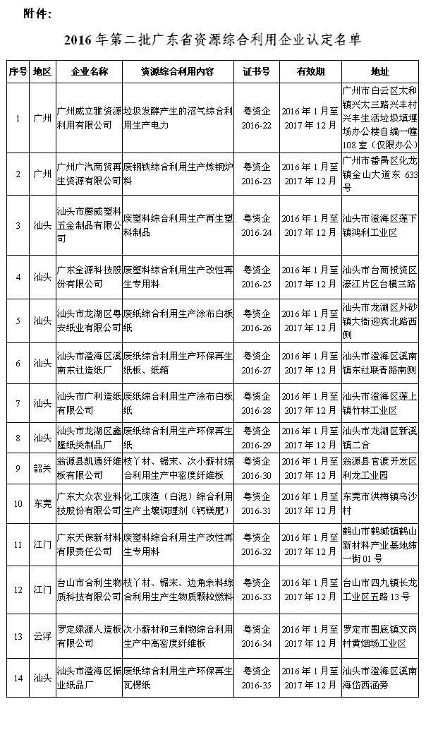 关于公布2016年第二批广东省资源综合利用企业认定名单的通知