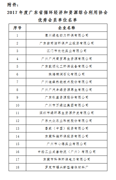 关于公布广东省循环经济和资源综合利用协会2017年优秀会员单位名单的通知