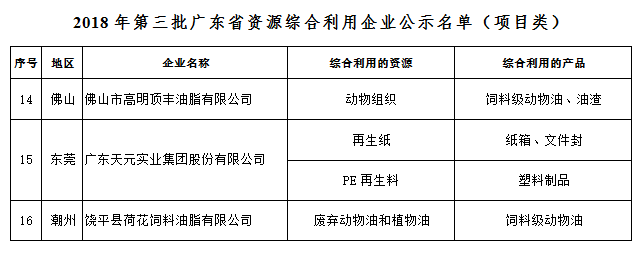 根据《关于印发〈资源综合利用产品和劳务增值税优惠目录〉的通知》(财税〔2015〕78号)、《关于公布资源综合利用企业所得税优惠目录(2008年版)》(财税〔2008〕117号)、《广东省循环经济和资源综合利用协会关于开展广东省资源综合利用企业评价管理工作的通知》(粤循综协〔2018〕16号)要求,经企业申请、专家评审,初步评价佛山市高明顶丰油脂有限公司等16家企业为广东省资源综合利用企业。现予以公示,时间5天。如有异议,请于公示期间以书面形式向省循环经济和资源综合利用协会反映。