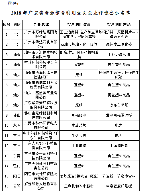 附件:2018年广东省资源综合利用龙头企业评选公示名单