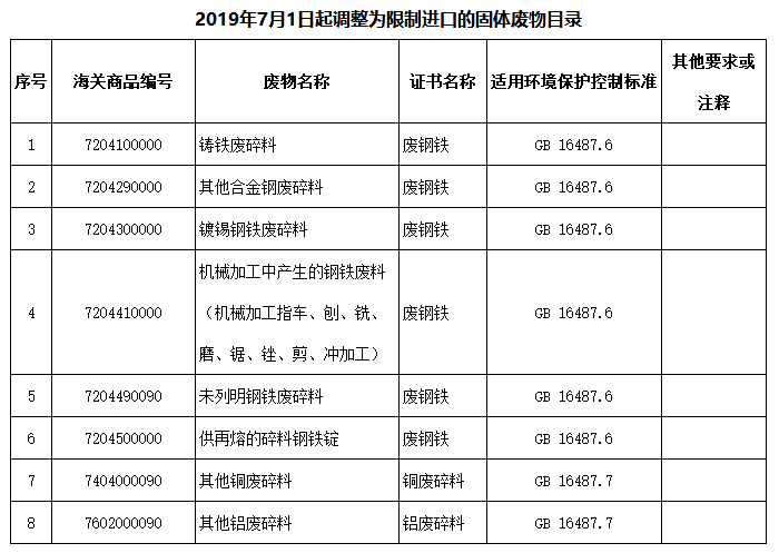 将废钢铁、铜废碎料、铝废碎料等8个品种固体废物(见附件),从《非限制进口类可用作原料的固体废物目录》调入《限制进口类可用作原料的固体废物目录》,自2019年7月1日起执行。