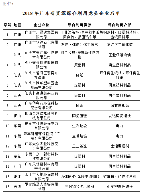 关于公布2018年广东省资源综合利用龙头企业名单的通知