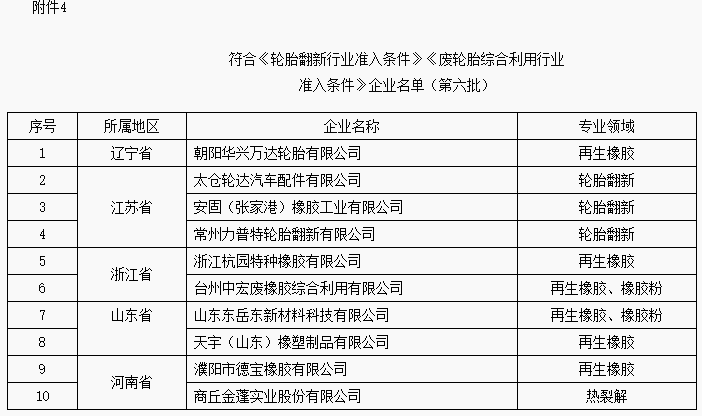 4. 符合《轮胎翻新行业准入条件》《废轮胎综合利用行业准入条件》企业名单(第六批)
