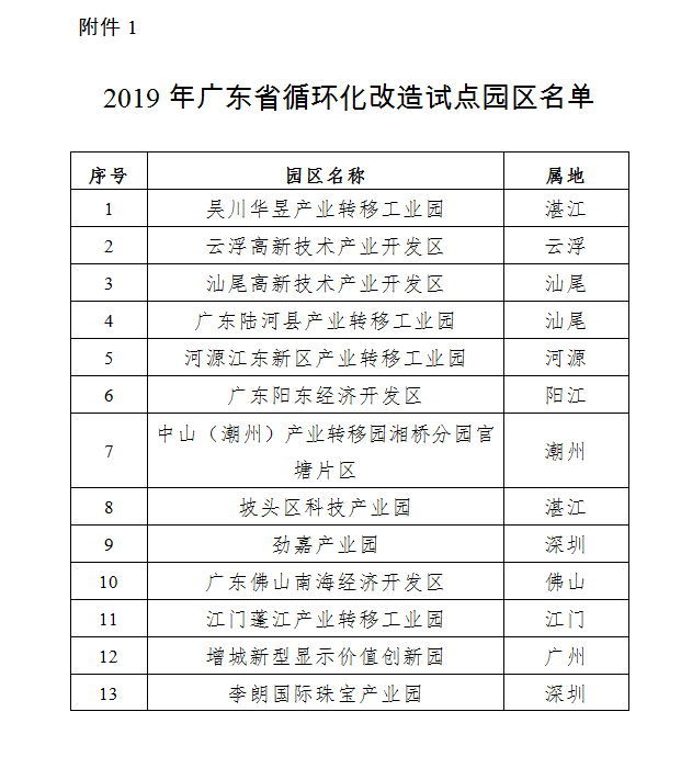 根据全省循环经济发展工作部署,我厅组织开展了2019年度园区循环化改造工作。经园区自愿申请、地市初审推荐、专家审查评估,吴川华昱产业转移工业园等13家园区列入2019年广东省循环化改造试点园区名单,现将名单(附件1)予以公布,并提出以下工作要求,请一并贯彻落实。