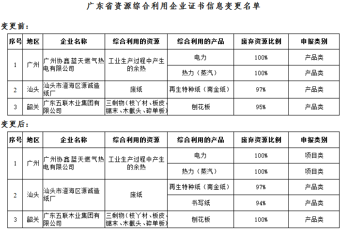 3、广东省资源综合利用企业证书信息变更名单