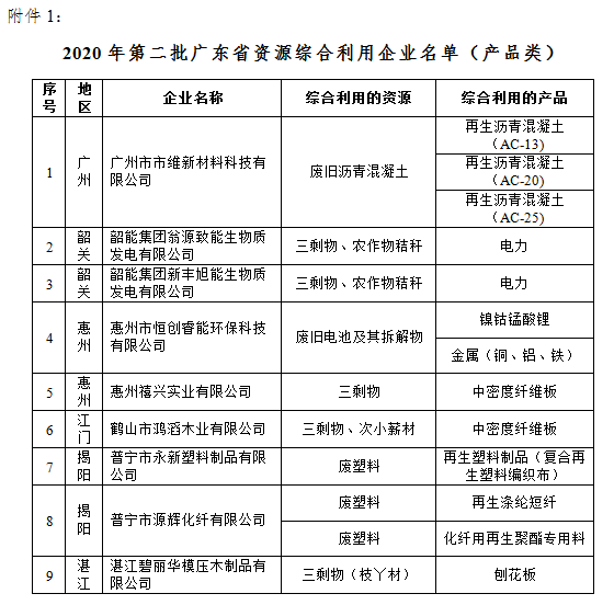 1、2020年第二批广东省资源综合利用企业名单(产品类)