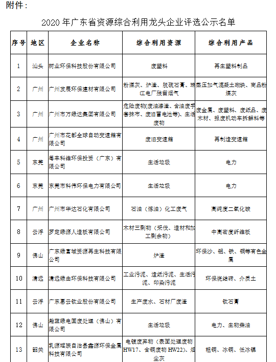 附件:2020年广东省资源综合利用龙头企业评选公示名单