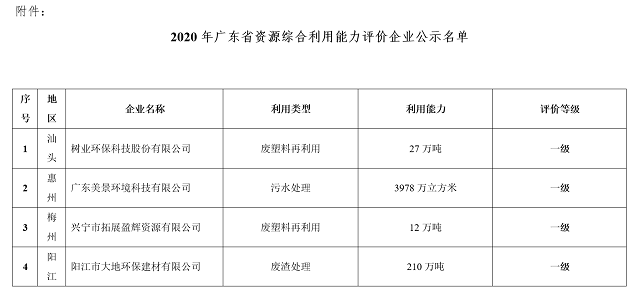 附件: 2020年广东省资源综合利用能力评价企业公示名单
