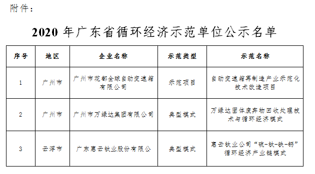 2020年广东省循环经济示范单位评审结果公示
