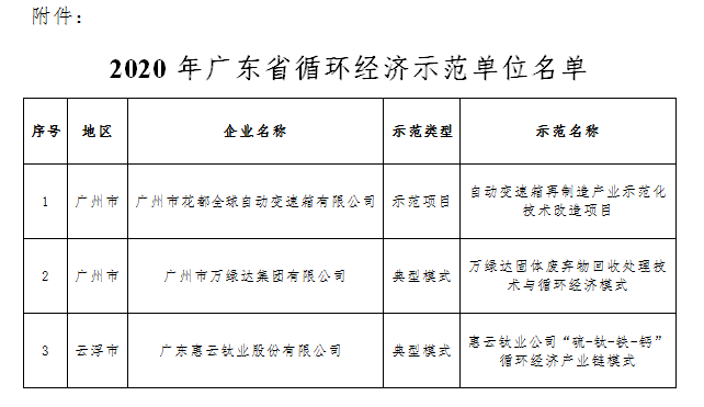 关于公布2020年广东省循环经济示范单位名单的通知