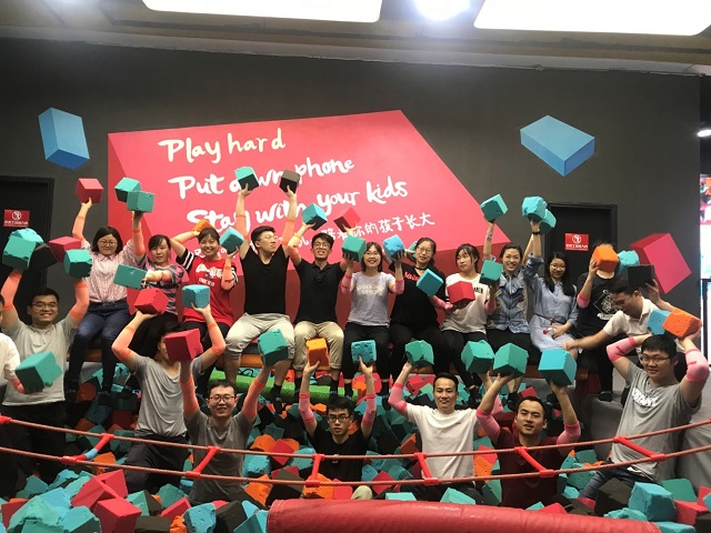 蹦床运动共设5大项目,全体员工在专业教练的带领下,集体热身并分为两支队伍进行团体对抗。大家在一片队伍口号欢呼声中,点燃了挑战极限激情,共享着运动快乐。