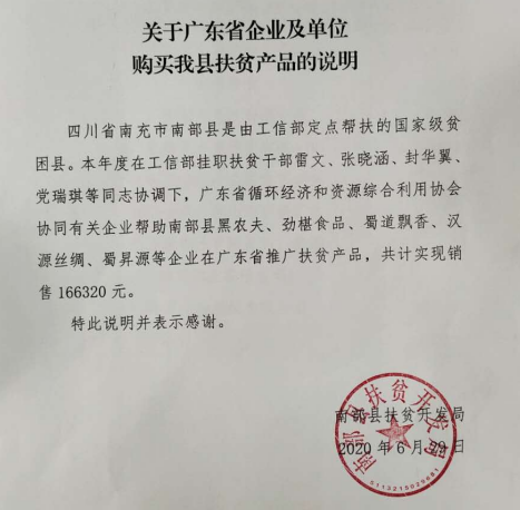 此外,协会和党支部还积极响应脱贫攻坚工作部署,联合爱心企业共同帮助国家级贫困县——四川省南充市南部县黑农夫、劲椹食品、蜀道飘香、汉源丝绸、蜀昇源等企业在广东省推广扶贫产品,并以“以购代捐”的形式完成166320元产品的采购。