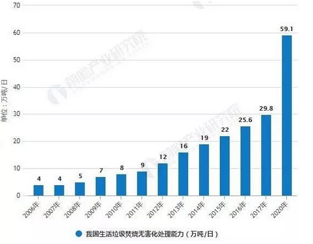 我国生活垃圾焚烧无害化处理能力(仅包含设定城市)近年来保持了较快增长,据前瞻产业研究院发布的《中国垃圾焚烧炉行业市场需求与投资规划分析报告》统计数据显示,截至2017年我国城市生活垃圾焚烧产能达到29.8万吨/日,垃圾焚烧处理能力2012-2017年处于持续高投产状态,其中2012-2016年平均年新增产能约为3.2万吨/日,2017年城市新增垃圾焚烧产能较2012-2016年平均新增产能值提升1万吨/日,达到4.2万吨/日。按照当前趋势及“十三五”规划,预计到2020年,我国垃圾焚烧产能将达到59万吨/日。