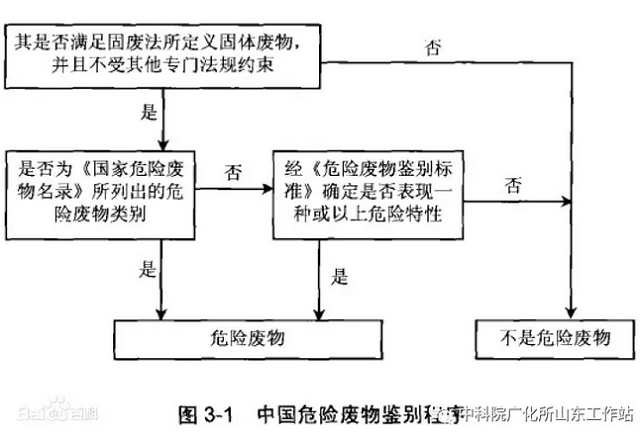 危险废物是指列入国家危险废物名录或根据国家规定的危险废物鉴别标准和鉴别方法认定的具有危险特性的固体废物。危险废物与一般固体废物的鉴别如下图所示。
