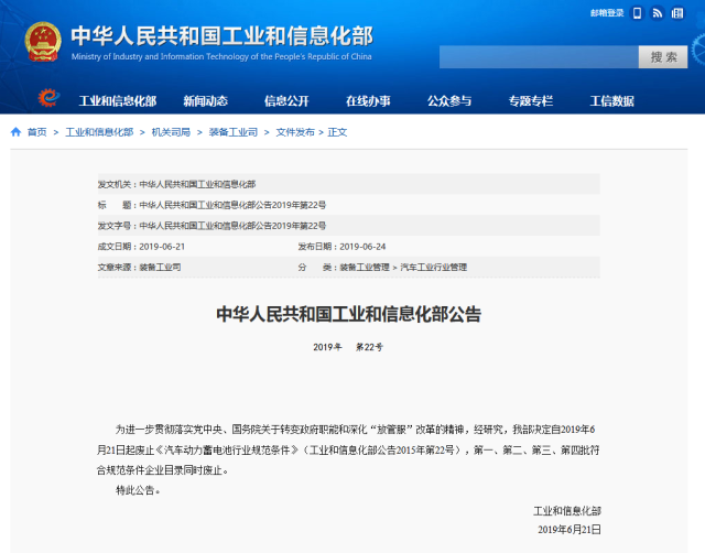 6月24日,工业和信息化部发布公告(2019年第22号)显示,为进一步贯彻落实党中央、国务院关于转变政府职能和深化“放管服”改革的精神,经研究,决定自2019年6月21日起废止《汽车动力蓄电池行业规范条件》(工业和信息化部公告2015年第22号),第一、第二、第三、第四批符合规范条件企业目录同时废止。