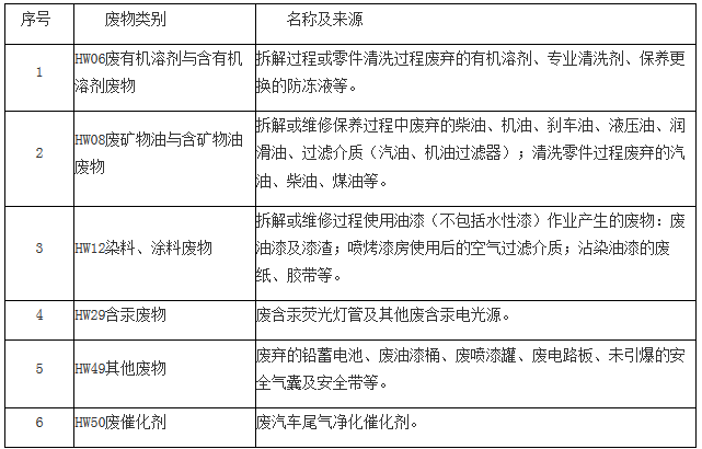答:危险废物是指列入国家危险废物名录或者根据国家规定的危险废物鉴别标准和鉴别方法认定的具有危险特性的固体废物。危险废物通常具有毒性、反应性、感染性、腐蚀性、易燃性等一种或一种以上危险特性,如果收集、贮存、运输、处置不当,将严重污染环境或对人身健康造成损害。根据2016年修订的《国家危险废物名录》,机动车维修和报废机动车拆解行业危险废物主要有6大类:一是废矿物油与含矿物油废物(HW08),常见的有废发动机油、制动器油、自动变速器油、齿轮油等废润滑油;二是染料、涂料废物(HW12),常见的有各类废油漆、漆渣等;三是其他废物类(HW49),常见的有废铅蓄电池、废机油滤清器、废活性炭、废过滤棉、废电路板以及沾染了危险废物的各种废弃漆桶、废油桶等。四是废有机溶剂与含有机溶剂废物(HW06),常见的有废弃的有机溶剂、专业清洗剂、保养更换的防冻液等。五是含汞废物(HW29),包括废含汞荧光灯管及其他废含汞电光源。六是废催化剂(HW50),主要是废汽车尾气净化催化剂。详见下表。