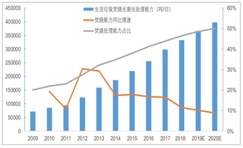 我国垃圾焚烧处理能力增长及其占比变化及预期
