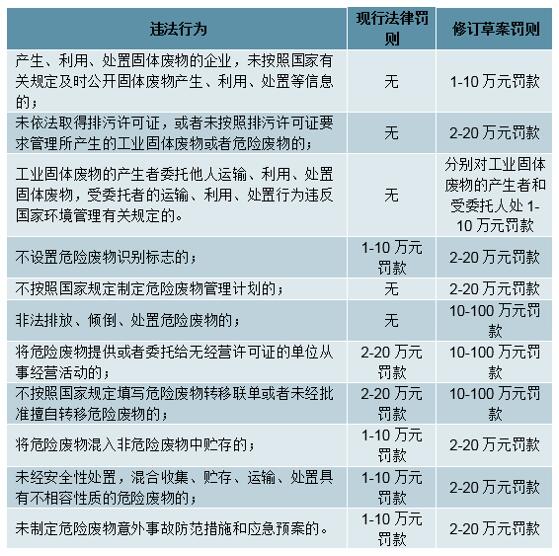 2018年,生态环境部针对《中华人民共和国固体废物污染环境防治法》(后简称《固废法》)发布了第二次较大幅度修订案的征求意见稿。新版法规强化了生产者的主体责任,并提出“生产者责任延伸制”,鼓励开展生态设计,建立回收体系,促进资源回收利用。原版《固废法》在20年内仅于2004年做出了第一次幅度较大的修改。新版本较老版本对部分违法行为的处罚力度大大加强,原版中一些没有具体罚则的行为在修订案中都加上了相应的法则,多项违法行为的罚款甚至大幅提升至100万元。新版《固废法》有望于今年下半年正式颁布实施,受其影响排污企业的固废处理成本将大大增加。根据国家规定,一般企业生产的固体废物必须交由有处理资质的第三方进行处理。