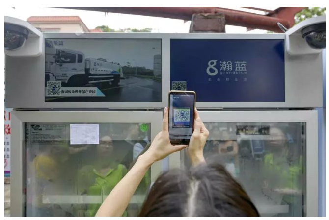 这款智能回收箱可以分类回收纸类、塑料、金属、玻璃制品。市民通过手机扫码打开箱门放置垃圾,可以获得积分。积分又可再转换为相应金额,用以在生鲜智能贩卖机上,购买生鲜水果或其他零食商品,全程实现智能化无人化操作,以此拉动居民垃圾分类的积极性。