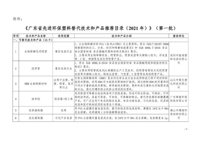 附件:《广东省先进环保塑料替代技术和产品推荐目录(2021年)》(第一批)