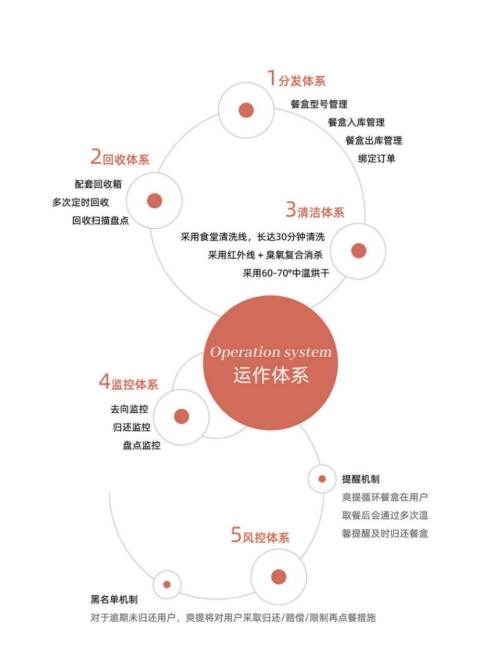 基本原理:爽提循环餐盒模式运作体系包括分发体系(餐盒型号管理、入库管理、出库管理、绑定订单)、回收体系(配套回收箱、多次定时回收、回收扫描盘点)、清洁体系(采用食堂清洗线,长达30分钟清洗,采用红外线+臭氧复合消杀,采用60-70℃中温烘干)、监控体系(去向监控、归还监控和盘点监控)和风控体系(提醒机制、黑名单机制)。