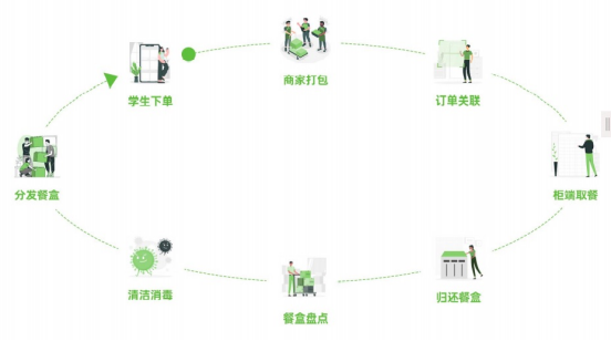 ⑩ 循环餐盒派发至各外卖商家,进入下一次使用循环。
