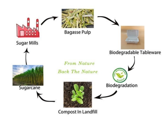 基本原理:产品采用植物浆料和利用独特的工艺,经特殊处理后,把浆料灌注到立体模具上,经脱水形成胚料,经定型后成为纸质混合餐具。产品使用废气后,在自然界中短期内完全自行降解成为二氧化碳和水,既来源于自然,又回归于自然。