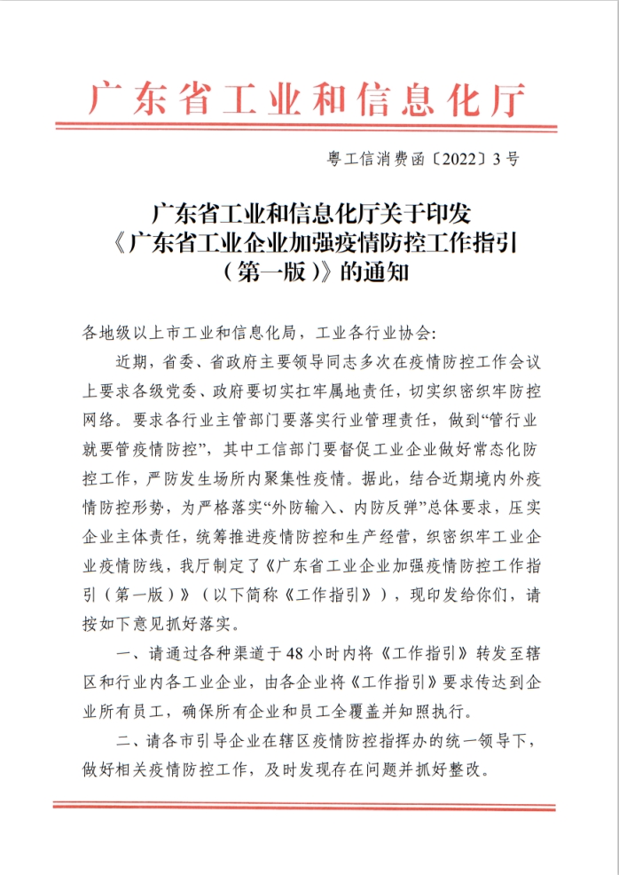 【转发】广东省工业和信息化厅关于印发《广东省工业企业加强疫情防控工作指引(第一版)》的通知