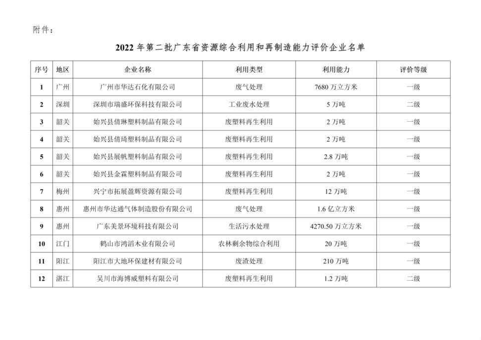 关于公布2022年第二批广东省资源综合利用和再制造能力评价企业名单的通知