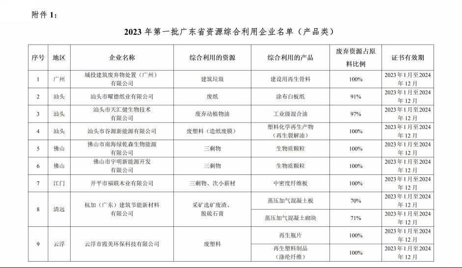 1、2023年第一批广东省资源综合利用企业名单(产品类)