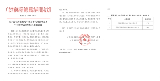 2023年3月,广东省制造强省建设领导小组办公室《关于加快推动新型储能产品高质量发展的若干措施》明确,鼓励广州、深圳等有条件的地市探索建设新能源汽车动力电池回收利用区域中心。区域中心试点的遴选由广东省新能源汽车动力蓄电池回收利用产业联盟组织,经专家评审与现场审查最终确定了优湃能源科技(广州)有限公司、深圳深汕特别合作区乾泰技术有限公司两家单位分别为广州市、深圳市新能源汽车动力蓄电池区域服务中心试点单位,试点期1年。