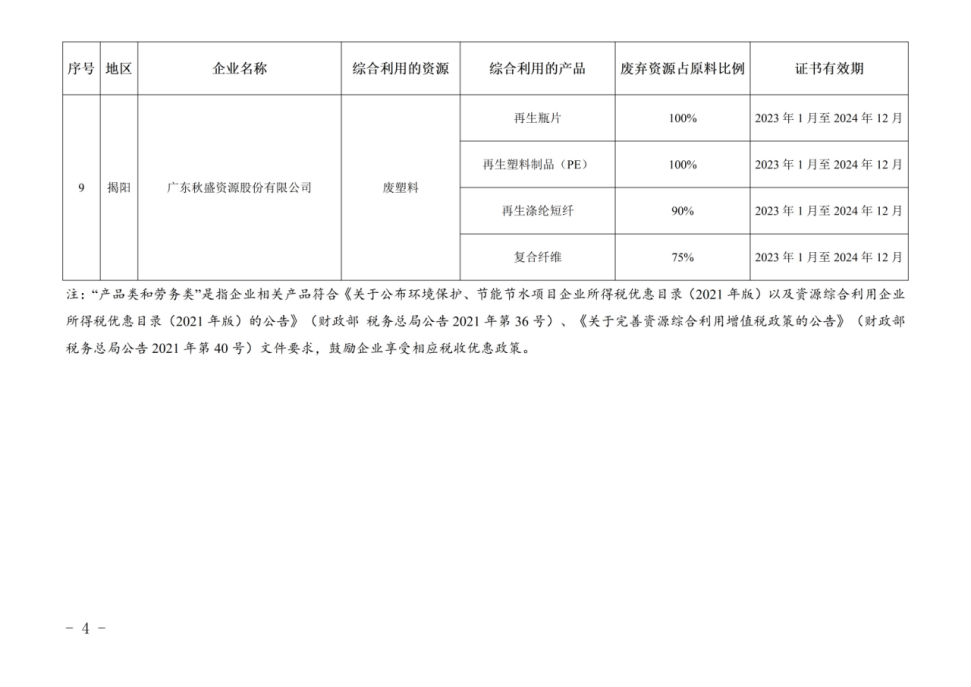 根据《关于公布环境保护、节能节水项目企业所得税优惠目录(2021年版)以及资源综合利用企业所得税优惠目录(2021年版)的公告》(财政部 税务总局公告2021年第36号)、《关于完善资源综合利用增值税政策的公告》(财政部 税务总局公告2021年第40号)、《资源综合利用企业评价规范》(GB/T 39780-2021)、《关于开展广东省资源综合利用企业评价管理工作的通知》(粤循综协〔2018〕16号)等要求,经企业申请、专家评审、公示,现评价汕头市广利造纸有限公司等18家企业为广东省资源综合利用企业,其中汕头市广利造纸有限公司等9家企业符合资源综合利用产品和劳务类,广州绿茵环保科技(集团)有限公司花都分公司等10家企业符合资源综合利用项目类。由协会颁发“广东省资源综合利用企业证书”。现将名单印发给你们,并就有关事项通知如下: