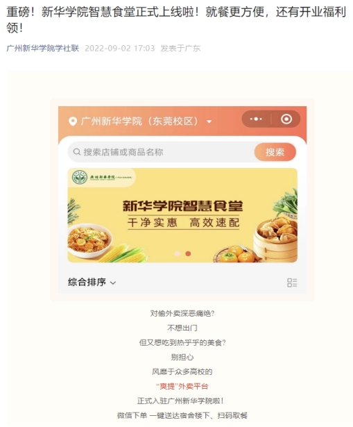 2022年8月,爽提循环餐盒外卖平台正式入驻广州新华学院,并在广东文理职业学院各大公众号上得到宣传推广,有效解决了校园偷外卖问题。同时,循环餐盒模式具有显著环境减排效益,为我国城市外卖包装垃圾减量、塑料污染治理、“无废城市”建设提供新模式。