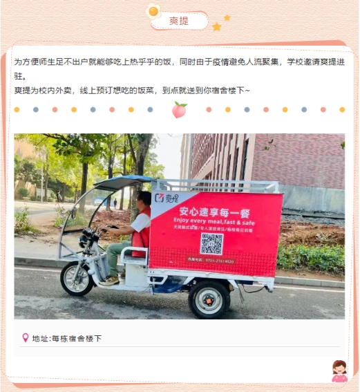 2022年11月,爽提循环餐盒外卖平台正式入驻广东文理职业学院,并在广东文理职业学院各大公众号上得到宣传推广,有效解决了校园偷外卖问题。同时,循环餐盒模式具有显著环境减排效益,为我国城市外卖包装垃圾减量、塑料污染治理、“无废城市”建设提供新模式。
