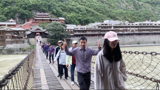 正值祖国74周年华诞之际,大家一同追寻红色印记—泸定桥。在漫长的历史中,泸定桥是中国四川和西藏之间茶马古道的交通咽喉,是中华边陲民族和睦、国家统一的安定桥,更以中国红军长征期间胜利飞夺泸定桥的伟大壮举和英雄业绩而名扬中外,以“十三根铁链托起一个共和国”载入中国革命的光辉史册。如今我们站在泸定桥上,感受当年红军不畏艰险、奋勇前行的精神,正所谓“大渡桥横铁索寒”,我们站成一列,互相搀扶,鼓起勇气走过了泸定桥,相信未来也能一同勇敢前行,迈过所有困难险阻。