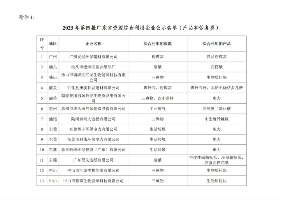附件:1、2023年第四批广东省资源综合利用企业公示名单(产品和劳务类)