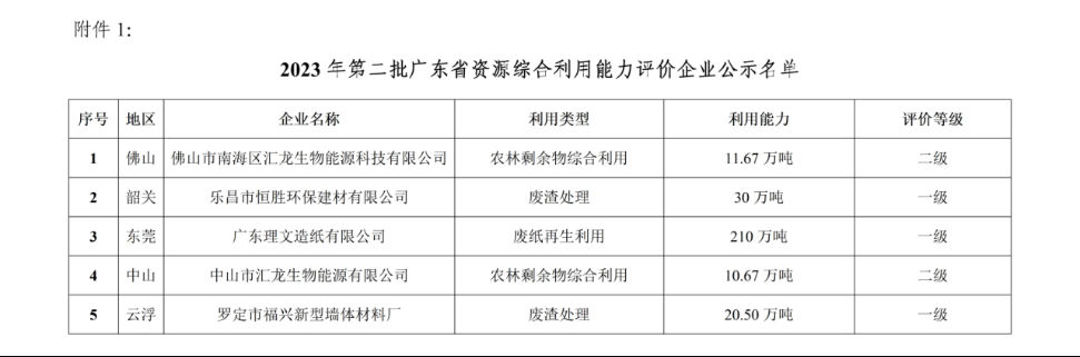 附件:1、2023年第二批广东省资源综合利用能力评价企业公示名单