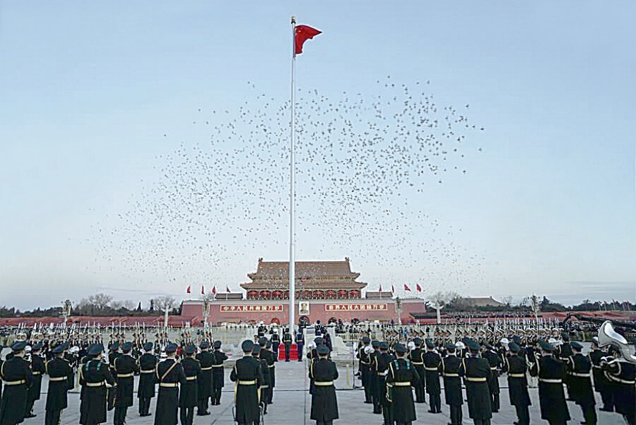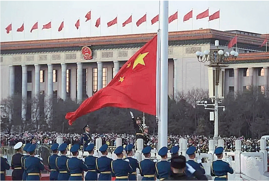 中国人民解放军军乐团奏响《义勇军进行曲》,升旗手挥动右臂划出优美弧线,鲜艳的五星红旗迎风展开,与喷薄的朝阳一同升起。