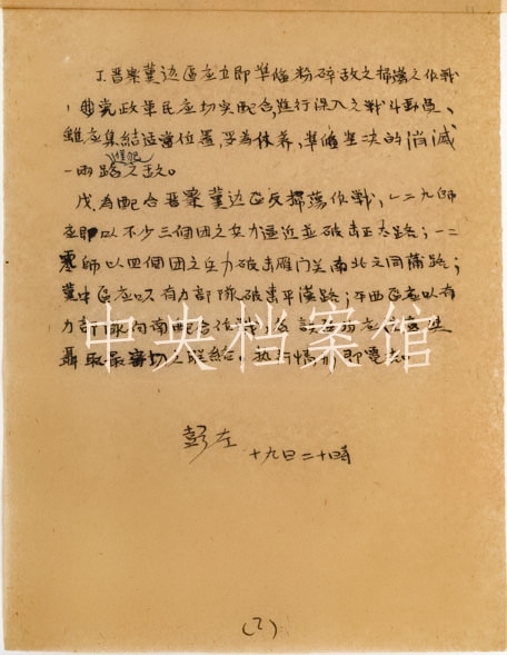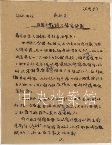 中央档案馆保存了一份1940年10月19日的电报,这是彭德怀、左权关于百团大战后的反“扫荡”计划,给聂荣臻、萧克等八路军将领及军委的电报。