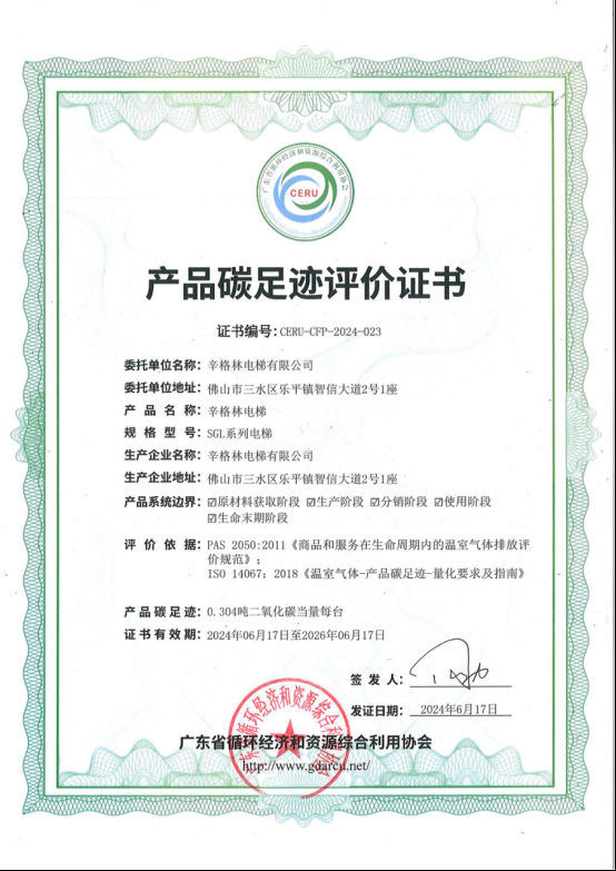 辛格林电梯有限公司辛格林电梯产品碳足迹评价证书